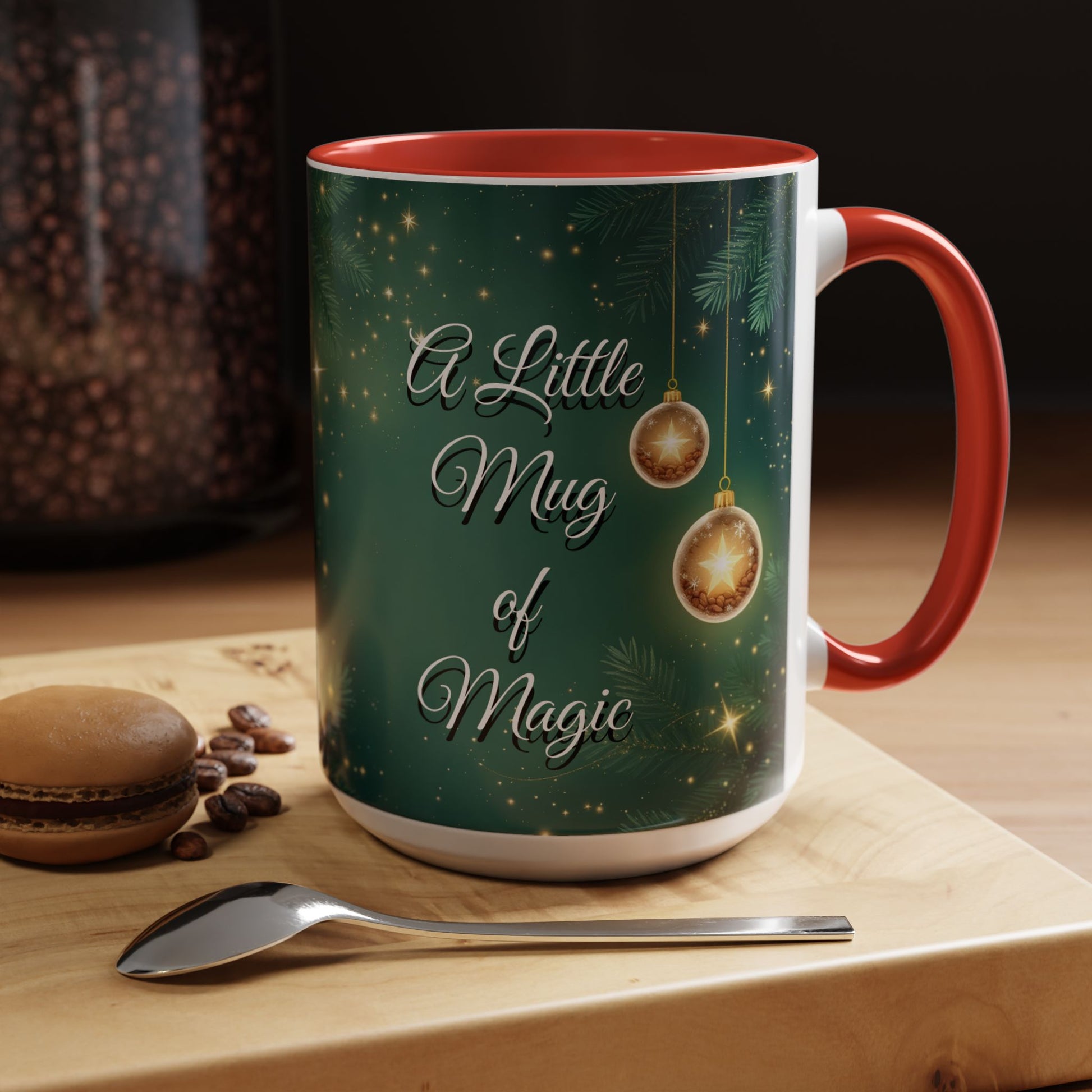 Celebrate the season with every sip introducing A little mug of magic 11oz & 15oz coffee mug, a radiant blend of holiday elegance and cozy charm. Wrapped in a lush green backdrop sprinkled with golden stars, this mug features glowing ornaments, pine branches, and the phrase “A little mug of magic” in graceful gold script. It's the perfect companion for winter mornings, gift exchanges, or fireside cocoa.