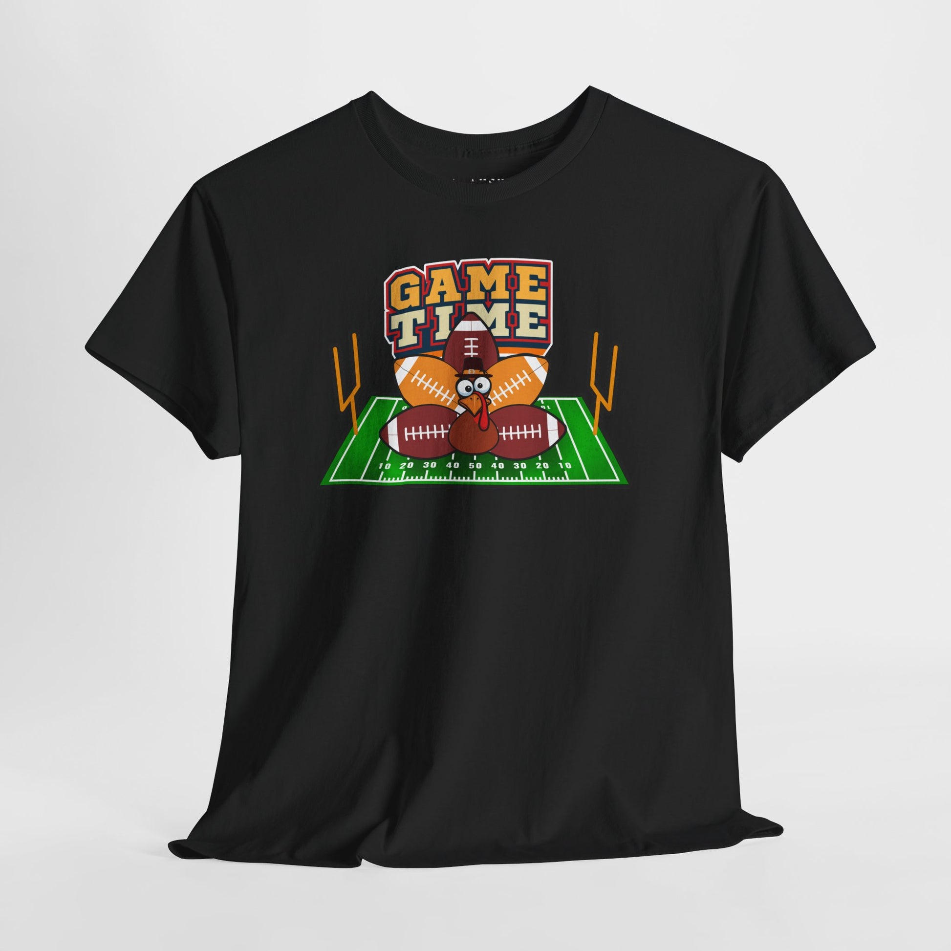 Kick off Turkey Day in style with this dark gray tee featuring a vibrant football field design and bold “GAME TIME” lettering. With five footballs, yard lines, and goalposts framing the action, this shirt brings the energy of the gridiron to your wardrobe. Perfect for tailgates, watch parties, or shouting at the screen from your couch. Printed on a Gildan 5000 for all-day comfort, no penalty flags here.