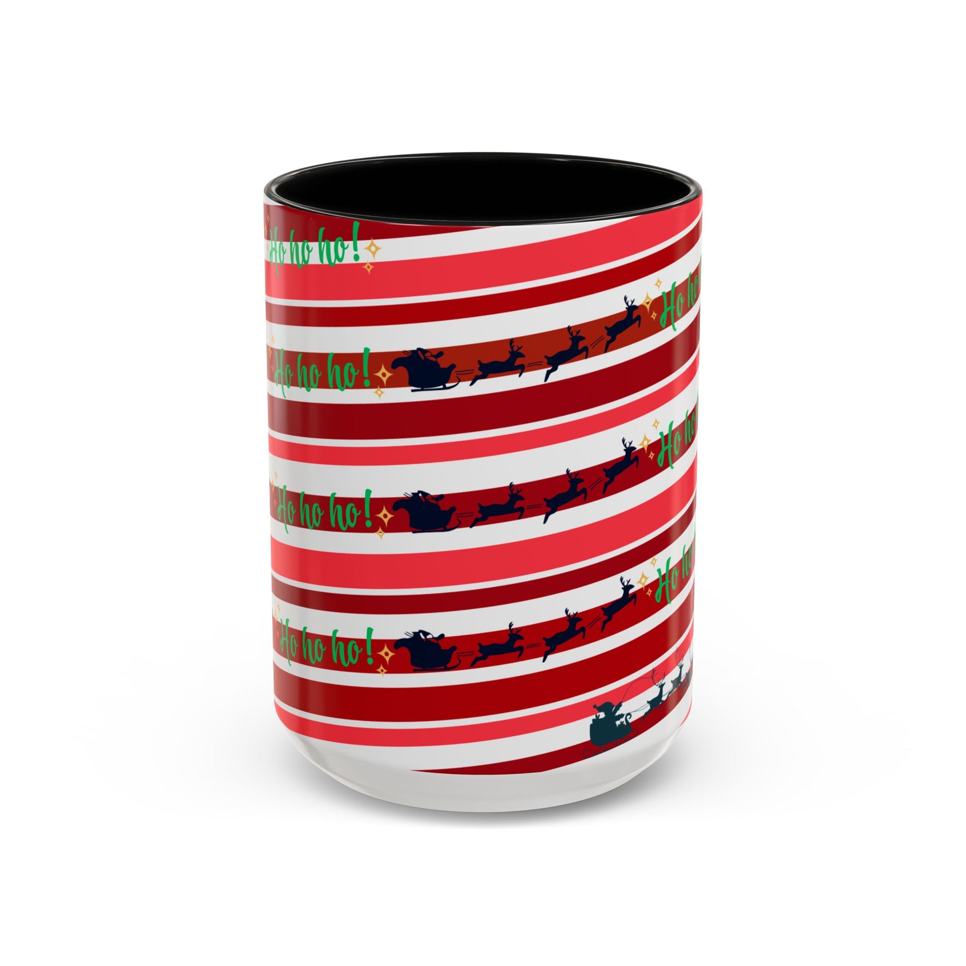 Celebrate the season with a mug that brings classic holiday charm and playful energy. This 15 ounce ceramic coffee cup features bold red and white stripes wrapped around the design with silhouettes of Santa in his sleigh and reindeer dashing across the band. The phrase Ho Ho Ho repeats in cheerful green and gold adding a touch of sparkle to your morning routine.