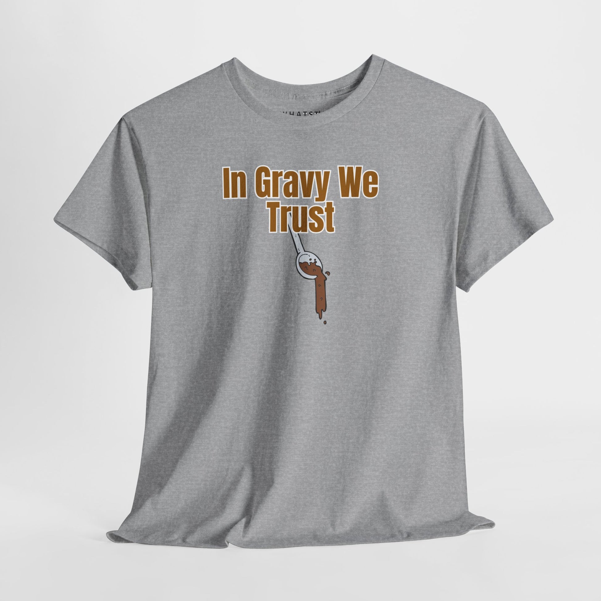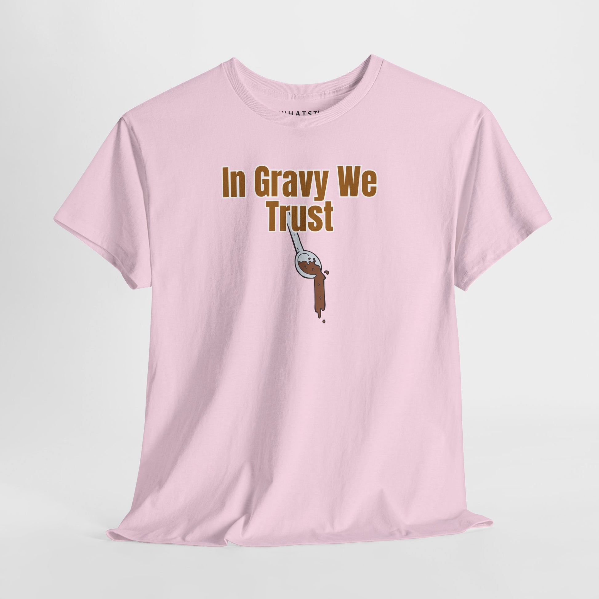 Declare your allegiance to the ultimate comfort food. This white tee features bold brown lettering and a dripping spoon of gravy, turning a classic phrase into a savory statement. Whether you're hosting Thanksgiving, hitting the leftovers hard, or just living life one ladle at a time, this shirt brings the flavor and the laughs. Printed on a Gildan 5000 for all-day comfort, no nap required.
