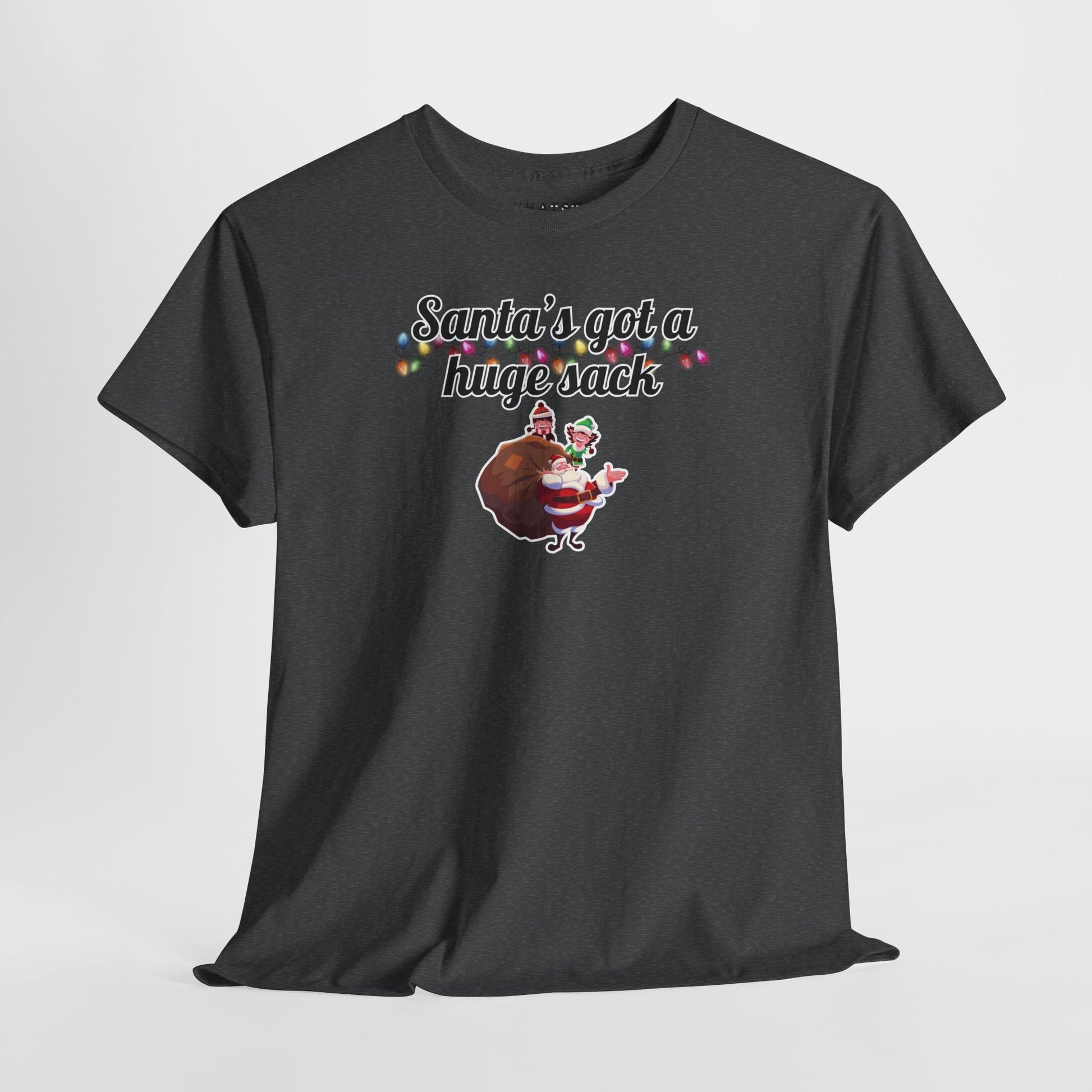 Big gifts, bigger laughs. This tee features a cartoon Santa hauling a massive sack over his shoulder, paired with the playful phrase “Santa’s got a huge sack” strung with colorful Christmas lights. It’s festive, flirty, and perfect for stirring up holiday mischief.